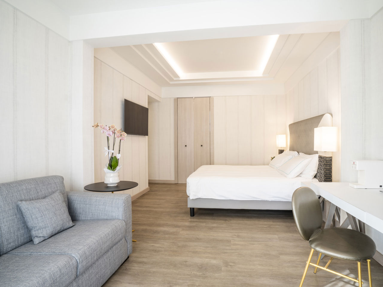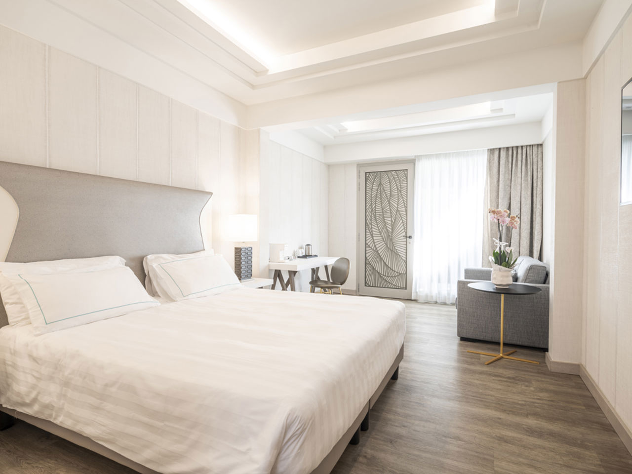 Die Junior-Suiten sind modern eingerichtet und verfügen über ein bequemes Kingsize-Bett sowie ein einzigartiges, dezentes Design in verschiedenen Farbtönen. Die Einrichtung verbindet die Energie des modernen Designs mit der Wärme eines gemütlichen Ambientes.